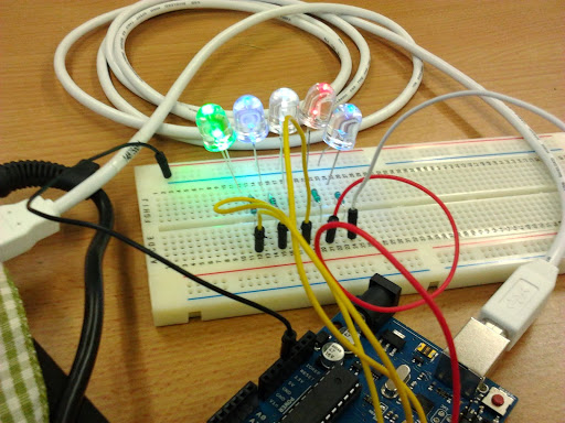 5 coloured LEDs lit using the program Arduino.