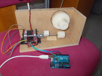 A worm gear that would increase the torque by an order of magnitude, and stop the blind from pulling down. Here’s the work in progress as we tested out the motor driver (and killed it, though fortunately had a spare) and programmed the microcontroller for speed and the correct number of rotations: