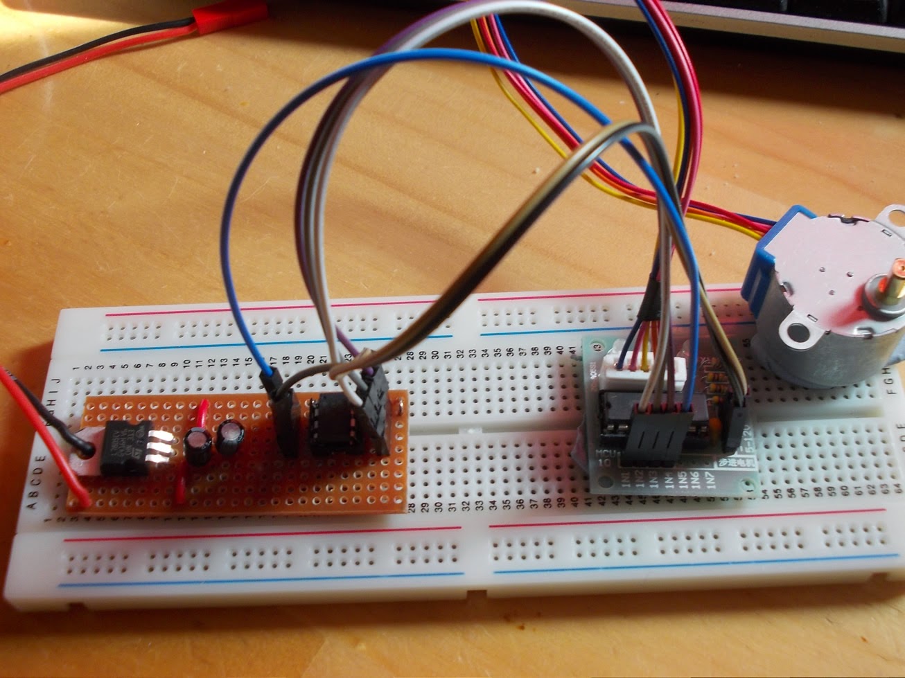 The ATTiny85 was programmed by piggy-backing on an Uno, which I have to say is very easy, although I eventually decided to make a programmer shield for the Uno so that you can just plug in the ATTiny85 directly into the shield and program it without needing to connect any wires. (Note: the stepper motor above was not used for Tim’s blind project – just for testing. He used much larger motors for his project).