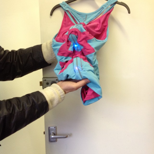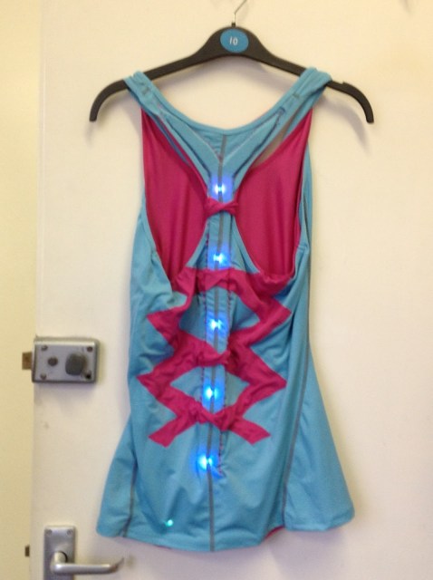 The UROP poster also displayed Laura’s work as part of the SPHEREresearch project.The project researches ideas for wearable technology to monitor health in the home. Laura was able to discuss ideas for wearable technologies with members of the team from systems engineering and worked towards developing a piece of clothing that could potentially monitor posture. She was able to research current trends in fashion and share with the technologists ideas to create a shirt that was attractive and practical. Her experiments with silicon rubber embedding the sensors highlighted problems with durability, size and comfort of the current projects sensors.The images below show a prototype teeshirt, the shirt has sensors to show spine position and also contains vibration. There is still much more to develop with this idea.