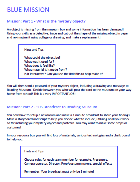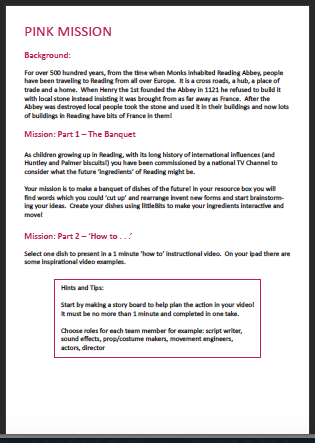 - 4 parallel ‘missions’ delivered in sealed coloured envelopes by senior leadership team, with accompanying resource boxes including tech, props and prompts: