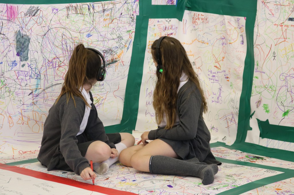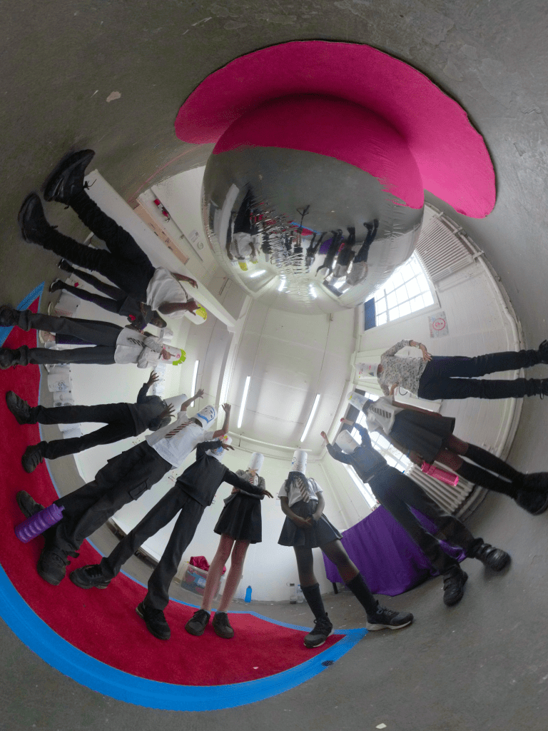 Locating activities in separately rooms appeared to increase concentration levels; pupils were no longer distracted by what others were doing, rather everything in the room was populated with ‘material’ for their activities. Utilising the colour coding from Tate also made it easier to guide the groups across different activities. Each room placed the pupil’s production (and that of previous groups) at its centre. In the selfie sphere room this took the form of a room peppered with consciously self-made images, exploring different forms of representation and self-expression across painting, drawing and photography. At its centre was the reflective sphere, a device for observing your image. Due the softness of the image reflected it encouraged impressions rather than tying pupils to a test of observation skills. Instead they were encouraged to depict themselves as they wished to; future selves, digital and avatar selves, costumed selves, cartooned selves, and in as little or much detail and coloured as they wished. Including everyone in the space, the 360 go pro then reiterates the group as subject, producing these incredible malleable images suggesting collaboration, theatre, globes, and portals.