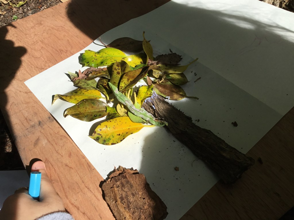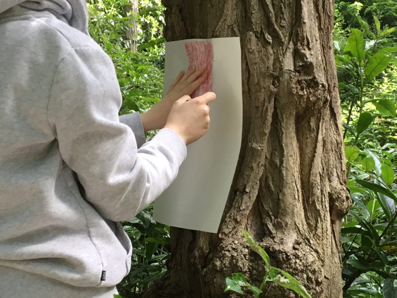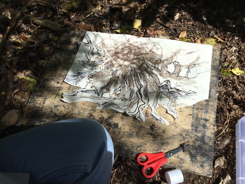 After that talk, we went outside to a small woodland area and investigated the trees. We did a variety of activities such as: mark making on paper against the trees, sketching different parts of the trees, taking lots of photos, and even listening to the sounds that trees make due to their different densities! It was very interesting finding out lots of facts about the trees. For example, I never knew how trees are all linked together under the soil by different types of spores. Overall, it was a very calming experience standing outside and embracing nature as I think we don’t do it often enough. I very much enjoyed learning more about two of my favourite subjects and combining them together. – Chloe UIV
