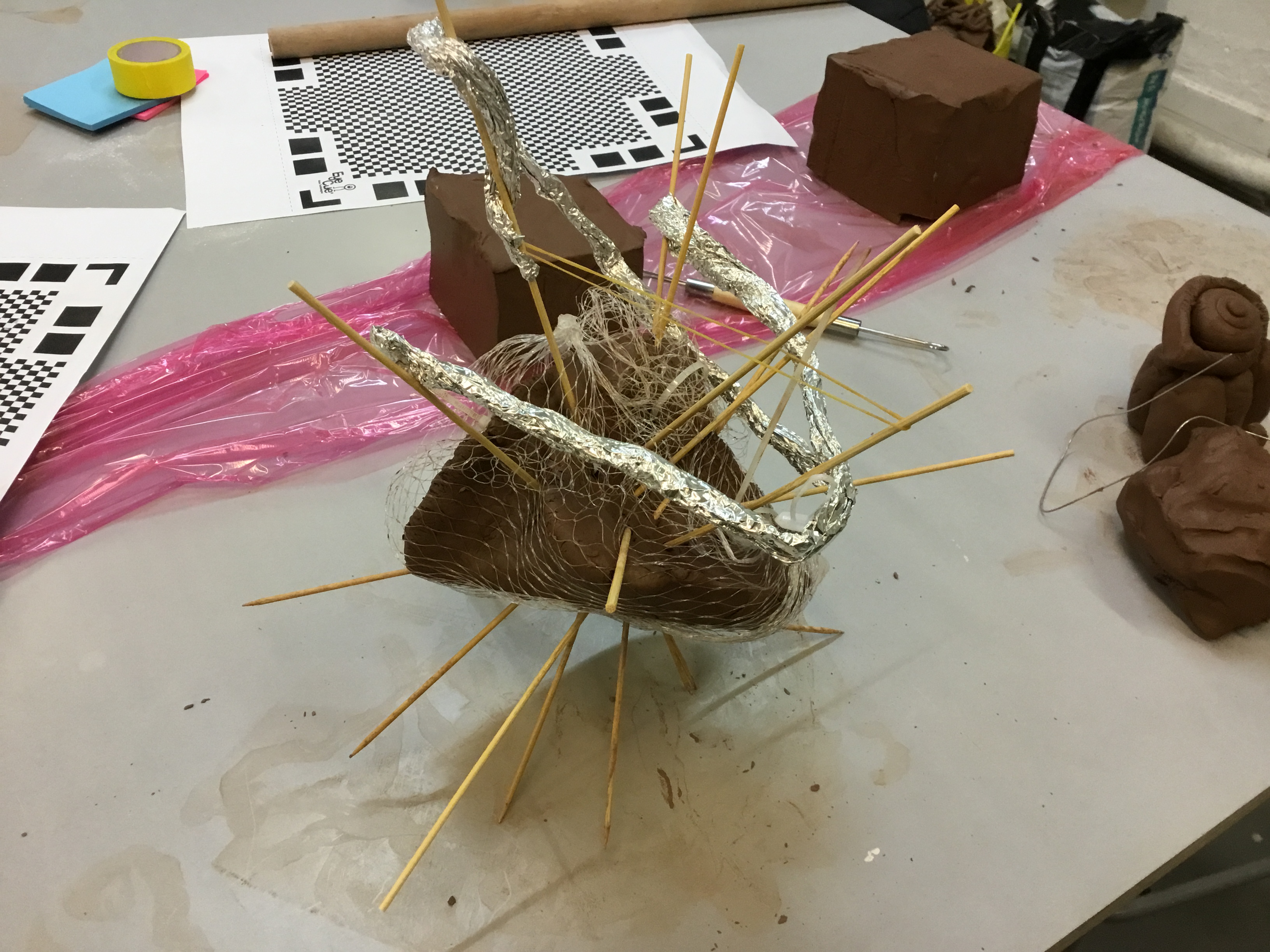After the presentation we took a similar approach to the sculpting session in week 1. Using the clay blocks to encourage and enhance our conversations around modification and mutilation. Following the creation of the sculptures each group would use the Qlone App on the iPad to scan their sculptures into augmented reality. Bridging a gap between the tactile nature of clay sculpting and the modern phenomenon of cloning technology.