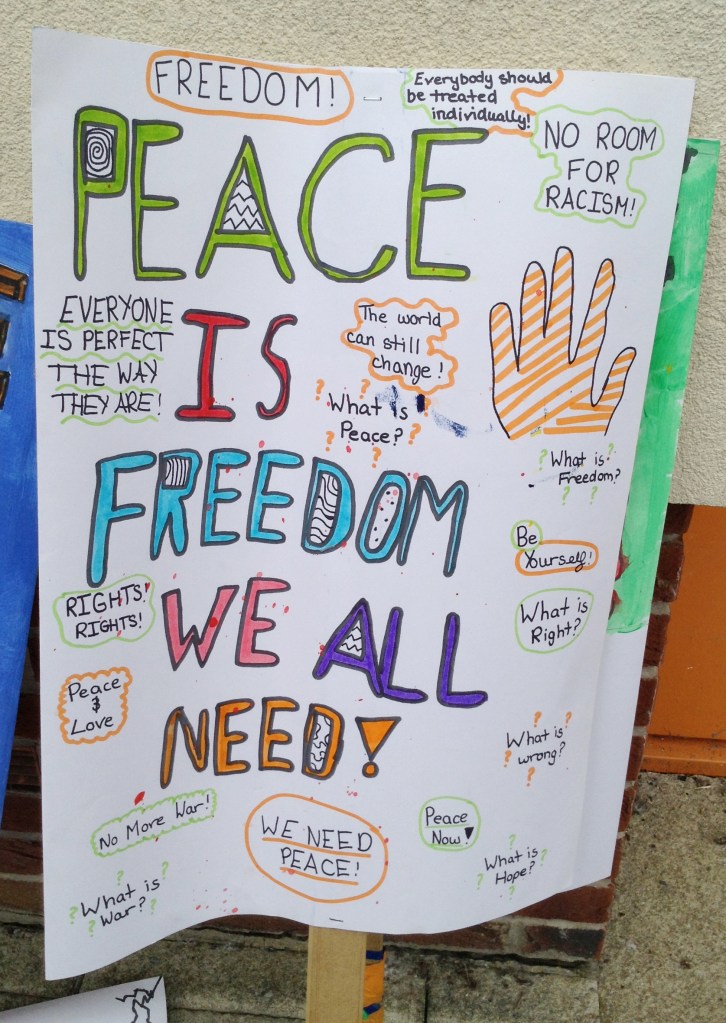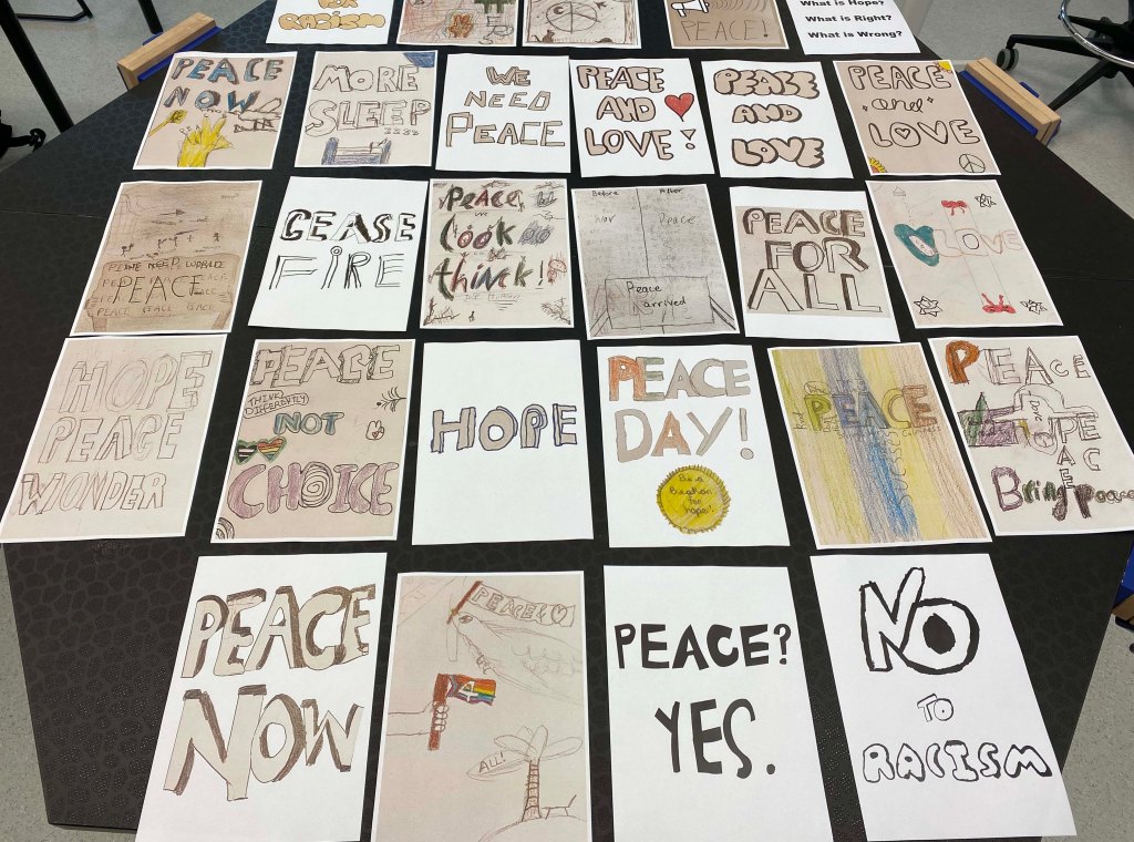 As we worked side-by-side with the children on the Universities London Road campus, each of us were allocated six 10-11 year old students. Supporting them in creating their own peace-themed posters. These young artists tackled complex social issues, such as LGBTQ rights, race, and war. Topics that we had thought were uneasy and too complex to explore. But their openness and perspectives reminded us that even the smallest voices have an important place in society.